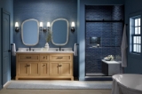 - Convenient tilt-down drawer under each basin for storing smaller, frequently-used items
